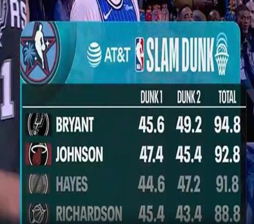 在预赛第二轮的较量中,卡特-布莱恩特得到49.2分、凯沙德-约翰逊得到45.4分、海耶斯得到47.2分、杰斯-理查德森得到43.4分。