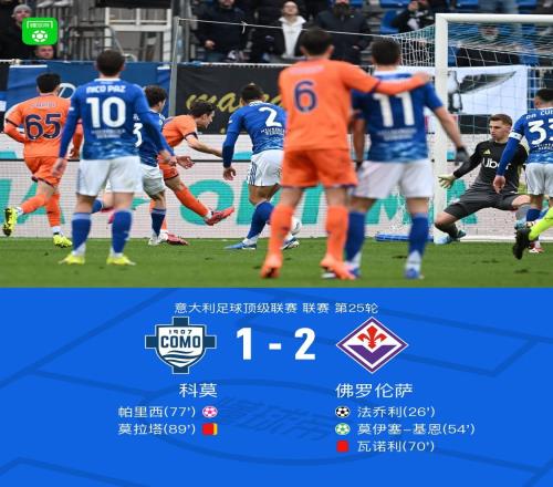 北京时间2月14日意大利足球顶级联赛第25轮,科莫主场对阵佛罗伦萨。佛罗伦萨法乔利率先破门,随后莫伊塞-基恩点球破门,帕里西自摆乌龙,比赛最后阶段,莫拉塔抱怨裁判连吃两黄被红牌