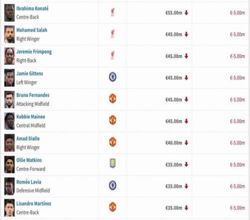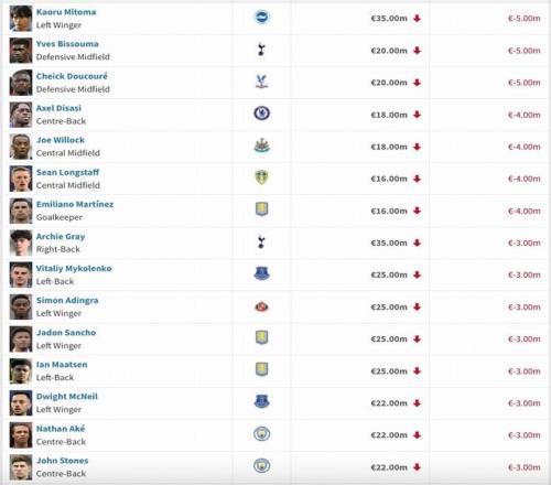 英超身价跌幅榜:罗德里、福登下跌2000万欧,维尔茨、萨卡下降1000万欧