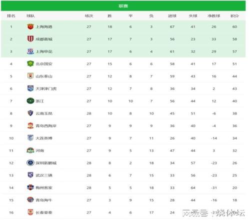 中超联赛积分榜