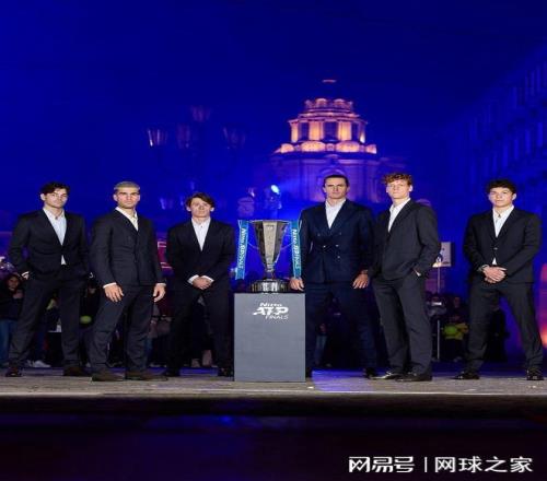 拍摄在都灵的夜间进行,实际的拍摄效果非常出色,激光束、闪耀的蓝光,以及置于照片中央的ATP总决赛奖杯共同构成了画面。奖杯象征着球员们一年以来努力争取的荣耀——那是一座高大的银色奖杯,宽阔的杯耳、锐利的线条和ATP 的标志一目了然。镜头里的所有布景都很完美,唯一的问题就是几张关键面孔的明显缺席。当然,阿尔卡拉斯和辛纳依旧以深色西装和自信的笑容抢尽风头。