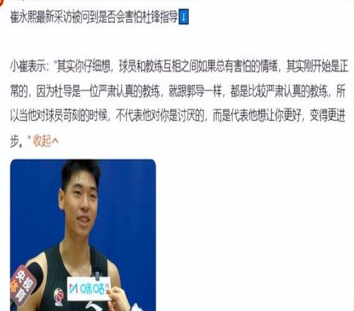 崔永熙也谈到了杜锋、杨瀚森等人的话题,但他最多的还是谈自己身体情况,他表示自己会努力康复争取赶上CBA新赛季的第一场比赛,他还表示一开始害怕杜锋指导属于正常情况。