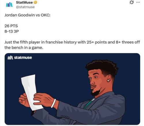 古德温本场也用行动回报太阳队的信任,替补16中9,三分13中8,爆砍26分4板,成为太阳队掀翻雷霆的最大功臣之一。
