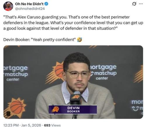 赛后被问到迎着卡鲁索这名顶级防守人出手三分是否有信心时,布克霸气回应道:“我相当有信心!”