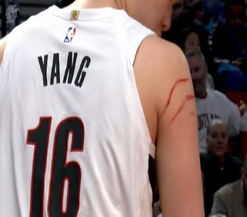 本场比赛,杨瀚森获得了相对多的出场时间,他也与火箭队主力中锋、联盟顶级力量内线史蒂文-亚当斯进行了正面对抗。在比赛期间,镜头给到了杨瀚森的右臂,赫然发现杨瀚森的右肩大臂附近出现了非常明显的两道大血印。