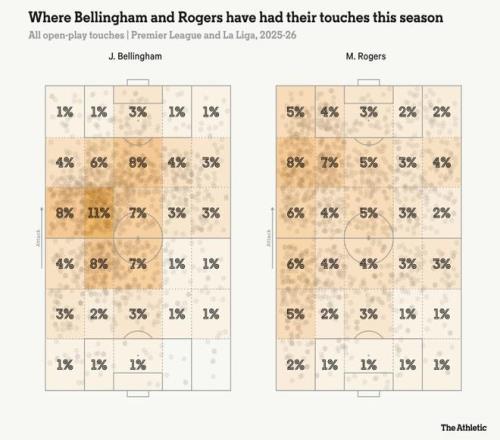 贝林厄姆尚未找回他在2023-24赛季的进攻巅峰状态——当时他在28场西甲比赛中打进19球。上赛季他仅有9球入账,本赛季至今也只有4球,不过这其中存在一些客观因素。他因肩伤恢复而推迟开启赛季,同时从下方触球热区图可以看出,他承担了比罗杰斯更多的防守任务,在进攻三区的触球比例低了11个百分点。