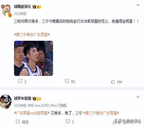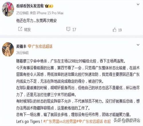 随着廖三宁命中绝杀,广东在主场以98比99输给北控,吞下主场两连败。