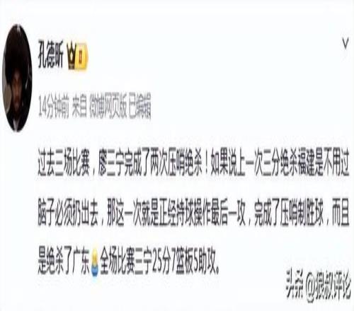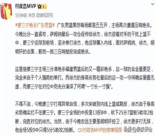 这是继廖三宁主场三分准绝杀福建男篮后的又一精彩绝杀,这一球的含金量更足,完全来自于个人强势的单打。而徐杰的身高劣势在最后的这一攻一守间确实暴露无遗,而廖三宁在对位中则充分演绎了何谓“一寸长一寸强”。