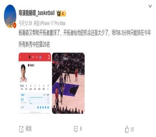 媒体人导演:杨瀚森场均只有8.3分钟只能排在新秀中的第25名,开拓者给他的机会还是太少了。