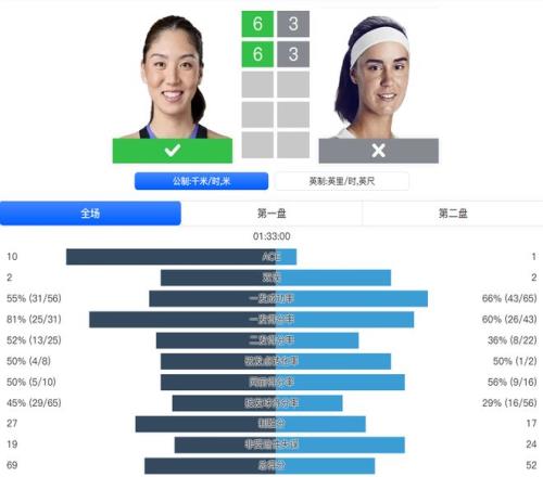 面对从资格赛打上来的卡利尼娜,王欣瑜此役交出了完美数据:超过8成的一发得分率,4次破发,27个制胜分。比赛过程一路顺风,仅耗时1小时33分钟便拿下胜利。下一轮她将和前法网女单冠军奥斯塔彭科隔网相对。