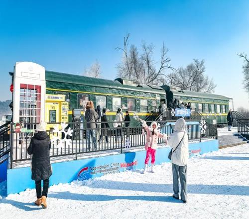 (游客打卡净月潭景区雪国列车)