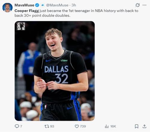 3.弗拉格成为东契奇后首位单场30+10+5的球员;