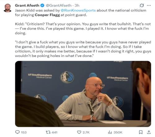 赛后记者询问基德怎么看待赛季初让弗拉格打PG被批判的话题,基德直接怒了,基德直接喷记者:我管你们XX怎么写,我打球的时候就是最顶级的球员,我干这一行这么多年我根本不在乎你们怎么说、怎么写,我TMXX清楚自己在做什么,你们爱怎么写就怎么写,我无所谓。