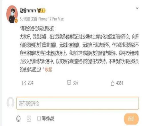 不得不说赵睿和他团队,或者说北京首钢队的公关团队确实厉害,出事后第一时间向球迷和社会公众道歉,不做过多的辩解,只说自己的不足之处,并且说自己认识到了错误要改正,态度也很好非常的诚恳,这样球迷也没有什么说的了。球员作为公众人物,尤其赵睿还是男篮国家队的队长,他更应该注意自己日常的言行,被球迷网友骂几句说几句感觉不舒服了自己可以私底下发牢骚,但是在网上和球迷网友互怼肯定是不行的,不管任何时候都要控制好自己的情绪。