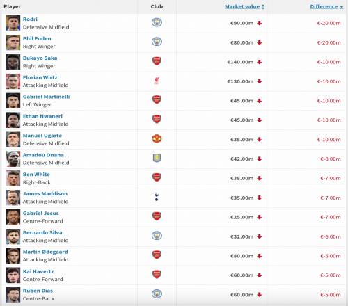 英超身价跌幅榜:罗德里、福登下跌2000万欧,维尔茨、萨卡下降1000万欧