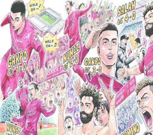 北京时间明天晚上23:30,利物浦将迎来英超第8轮主场对阵曼联的比赛,赛前,日本漫画出版社讲谈社发布了纪念漫画,其中的内容是2023年3月利物浦在主场7-0击败曼联。利物浦官方公告:讲