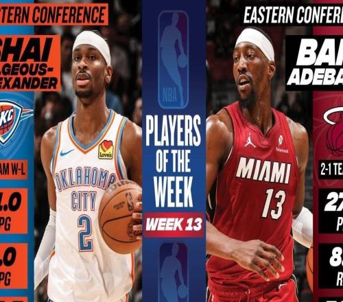 北京时间1月20日,NBA官方公布了第13周东西部的最佳球员,迈阿密热火的阿德巴约和俄克拉荷马雷霆的亚历山大分别当选。上周热火取得了2胜1负的成绩,3场比赛阿德巴约场均砍下27分8