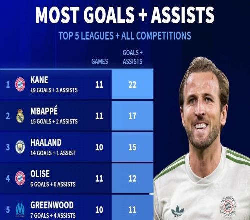 德转列五大联赛球员目前制造进球TOP10:凯恩造22球居首